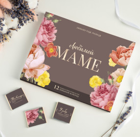 Набор 12 шоколадок "Любимой маме" (тёмный коричневый с цветами)