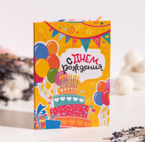 Открытка 4 шоколадки "С днем рождения (торт и шарики на ярко-желтом)"